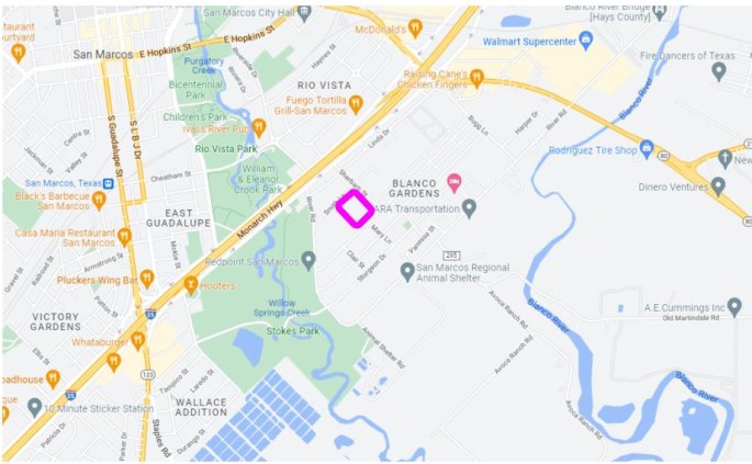 Here’s Blanco Gardens, and they want to rezone this pink square: