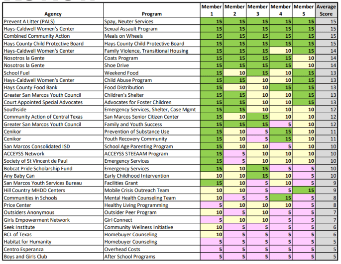 Matthew Mendoza: Great job! But I want to tinker with it. Any Baby Can is centered out of Austin. Let’s deduct $7K from them and give it to the San Marcos Youth Services Board, because that’s centered in San Marcos.