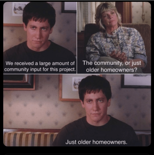 Usually developers send a representative to hearings, especially if it’s controversial like this. The representative would say sympathetic things to the neighbors, in a Bill Clinton “I feel your pain” kind of way. They can also answer questions and discuss compromises with city council. This is the bare minimum to pretending to care about the community.