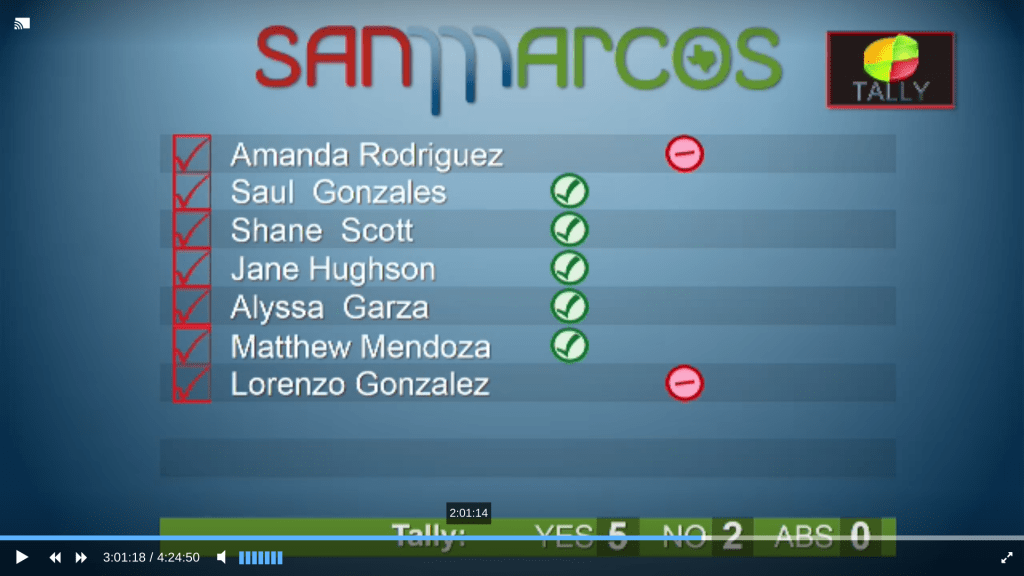 - At times, there can be issues that pit a district against the whole city. Amanda reports this happening at the state level: representatives vote against a program that is good for the entire state, because their district doesn’t want to pay the taxes for other people to benefit. Right now, all councilmembers answer to all of San Marcos.