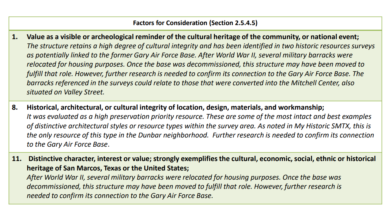 Matthew Mendoza had some useful points. First, he reached out to Ms. Armstead. Apparently her parents are the ones that brought the barracks over from Gary Air Force? He asked her about the historical significance of the building.