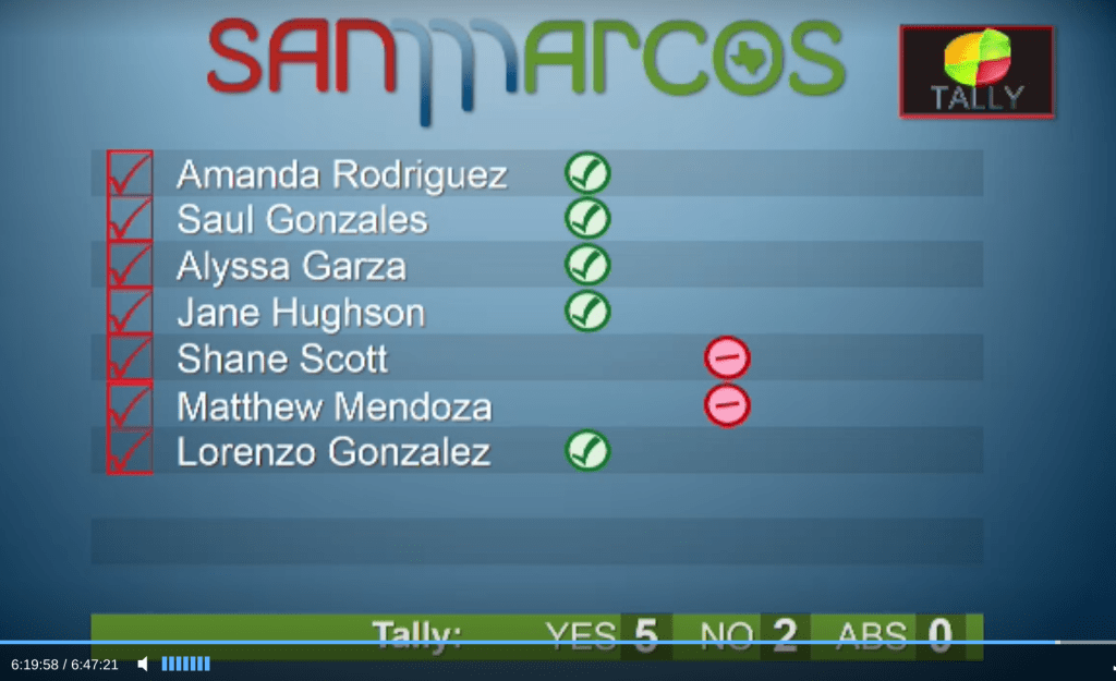 Finally, the vote: The motion is to deny. So a green check means no on the cameras, red dash means “yay Flock!”