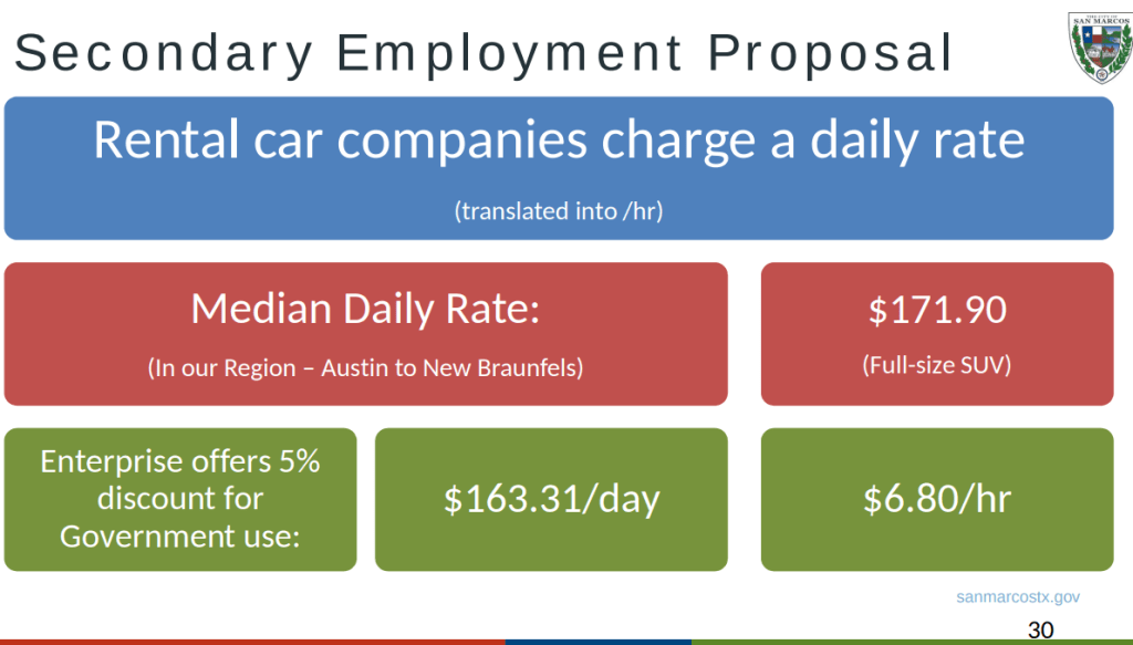 This is what Council cares about more. How much wear-and-tear is getting put on the vehicles when officers go on second jobs? Like SMCISD hires them to work a basketball game, or Amazon hires them to direct traffic? What about the wear and tear on the cars that occurs then?
