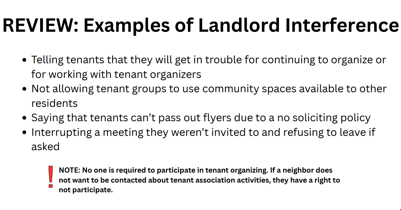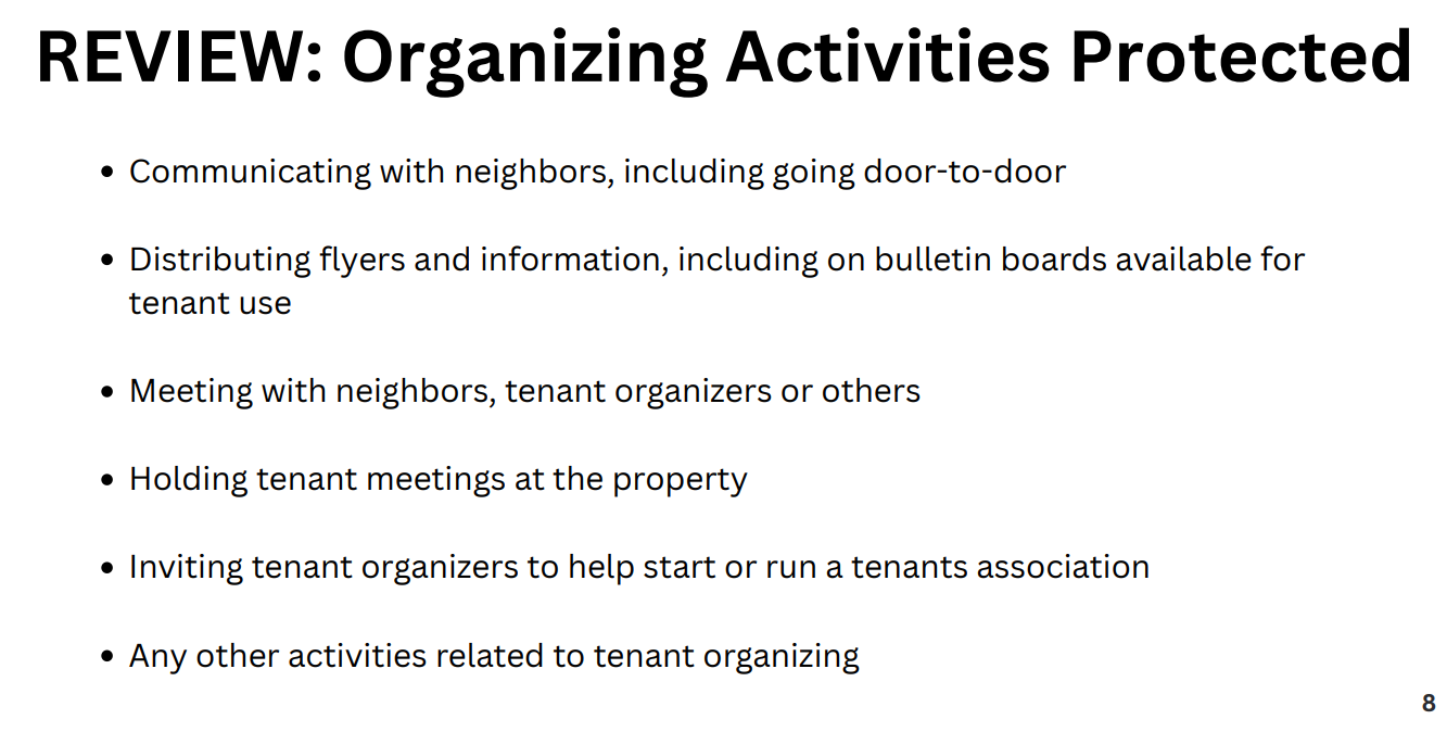 Basically, tenants should be able to talk to each other about their landlord problems, and form tenant organizations, and bring issues to their landlords as a united front, without worrying that they’ll get evicted or face retaliation.