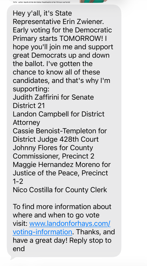 It’s REALLY hard to find a voting guide with recommendations, and the ballot is really long. Locally, I went with these from Erin Zwiener: