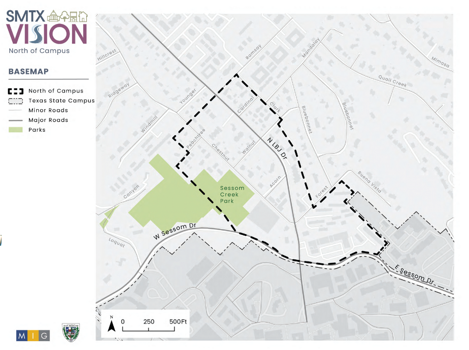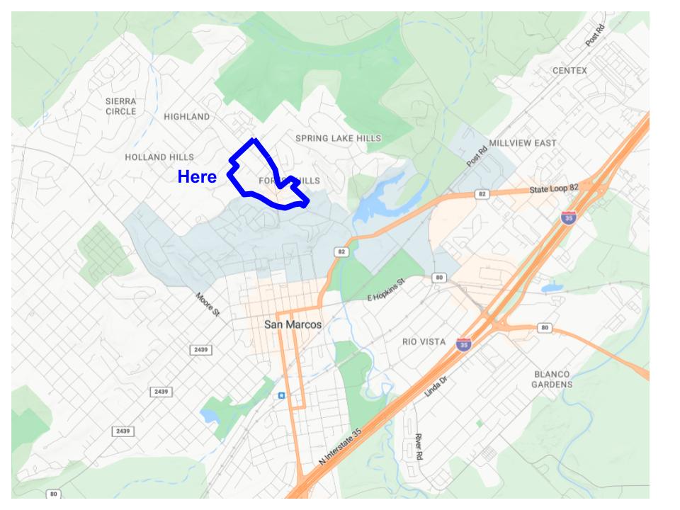 It’s actually pretty small. It’s a very Texas-State-feeling part of San Marcos – the Pie Society strip mall, a few bars and restaurants up LBJ, and a lot of small apartment complexes and rental houses.