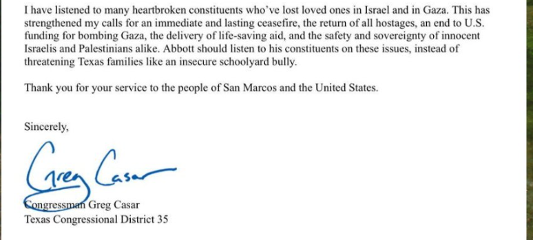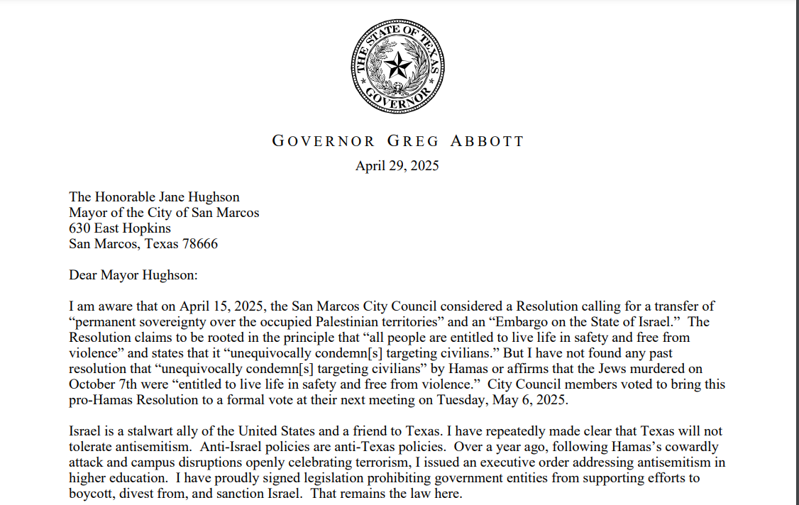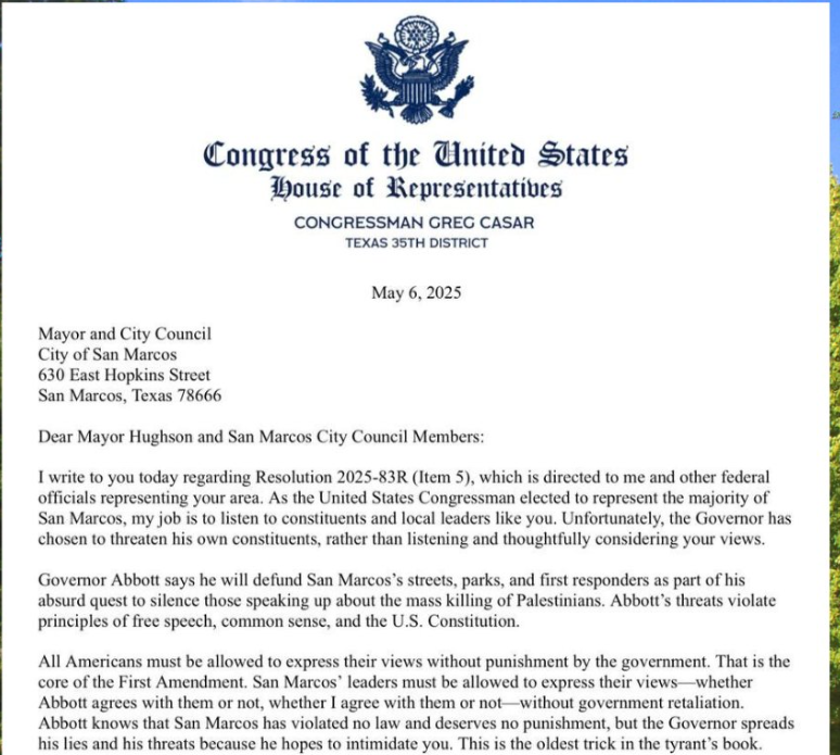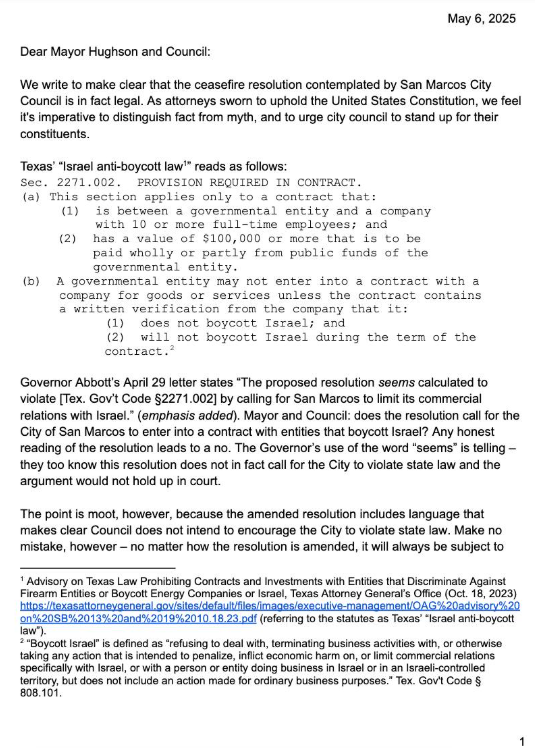 Earlier – I guess technically yesterday – I met with nonprofit leaders across Hays who expressed that they’re terrified of losing more federal and state funding, and frustration that this is all under the guise of federal fiscal responsibility. These neighbors – the people who are doing this work – they are our neighbors. We know them, we love them. We know they are underpaid, overworked, and absolutely essential, yet their work is being politicized and threatened by federal government. And yet some folks who spoke today expect San Marcans to plead with that same government to rely on them to stop a genocide? They won’t even entertain the pleas of those who provide lifelines to people in our own country.
