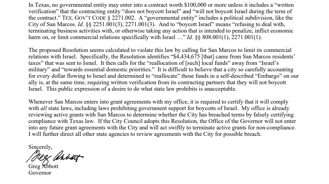 This is wild! Also very in line with Texas. (Did you know that all state contractors over $100K must sign a statement that they will not boycott Israel? Boycotting Israel is against state law, for anyone doing business with the state.)